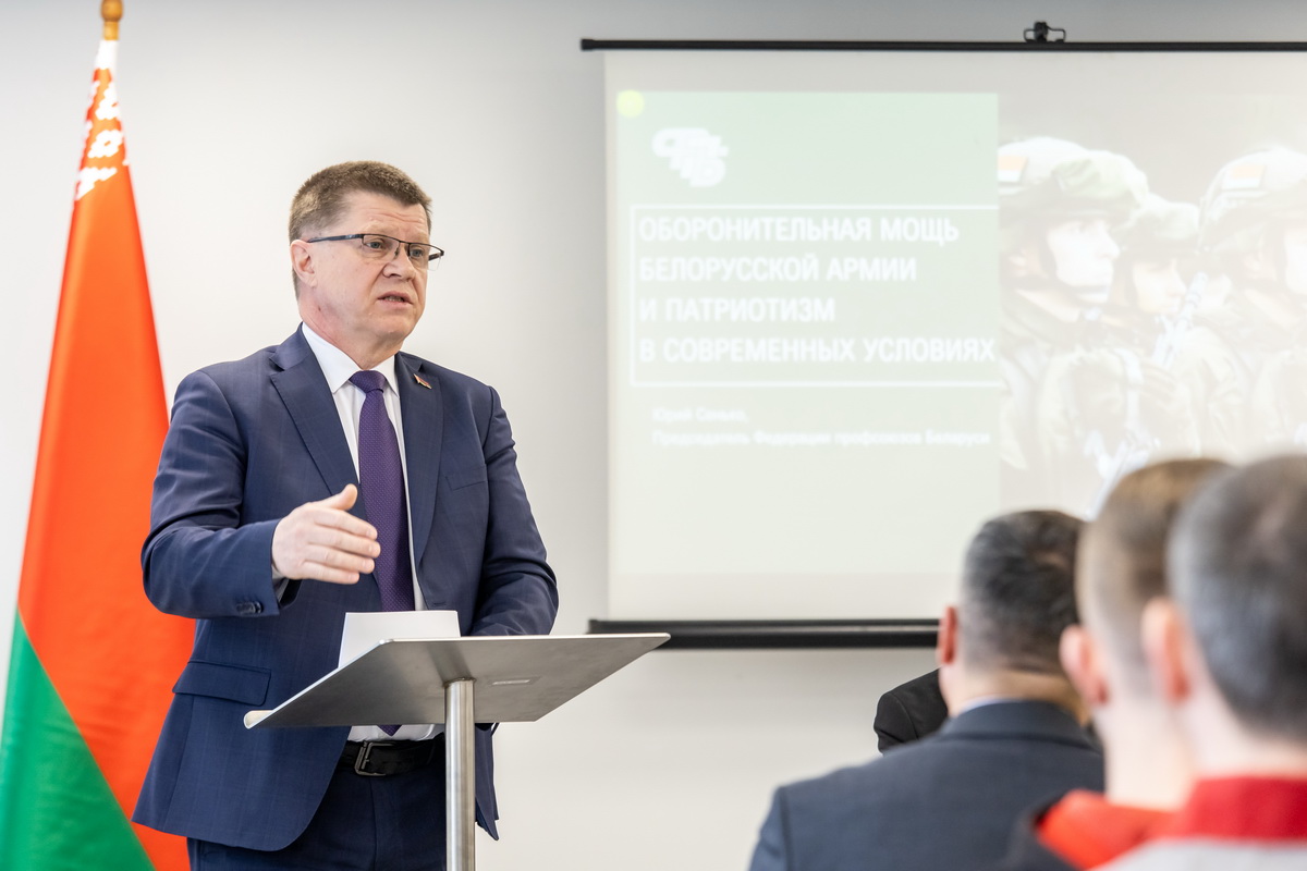 Юрий Сенько ознакомился с технологическими процессами и условиями труда, провел переговоры с руководством и пообщался с работниками. Обсуждали укрепление социального партнерства и, по сложившейся традиции, коснулись вопросов, которые стоят на повестке дня не только профсоюзного актива, но и всех граждан страны. В преддверии Дня защитников Отечества и Вооруженных Сил Республики Беларусь председатель ФПБ сделал акцент на значимости праздничной даты для консолидации общества и воспитания патриотизма.